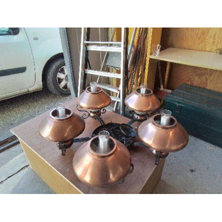 GRAND LUSTRE EN FER FORGÉ ABAJOUR CUIVRÉ